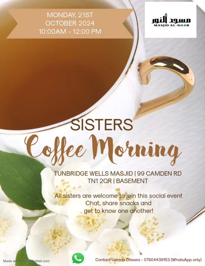We warmly invite you to our monthly Coffee Morning for Sisters, a special gathering designed to bring Muslim women together in a relaxed and welcoming environment. This event offers a wonderful opportunity to connect, unwind, and engage in meaningful conversations while enjoying a friendly and supportive atmosphere.