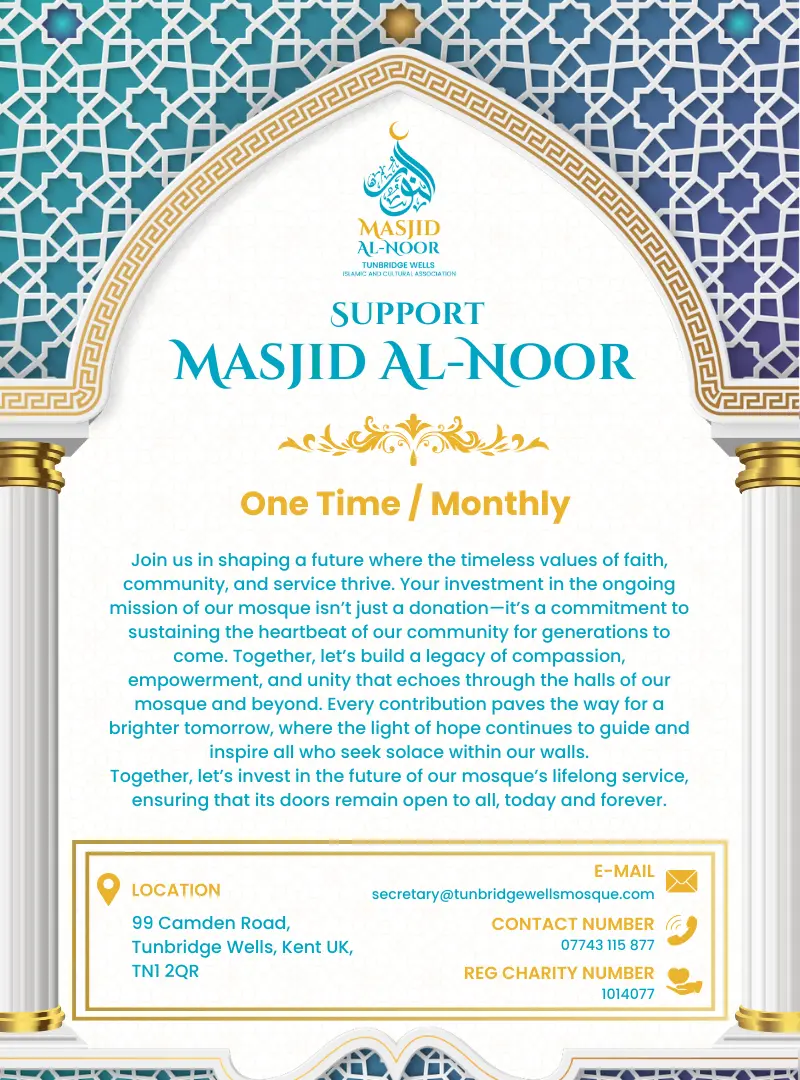 Make a direct bank transfer or set up a standing order to support the mosque’s activities and services. Your generous contributions help maintain the house of Allah and serve the community. Every donation counts.